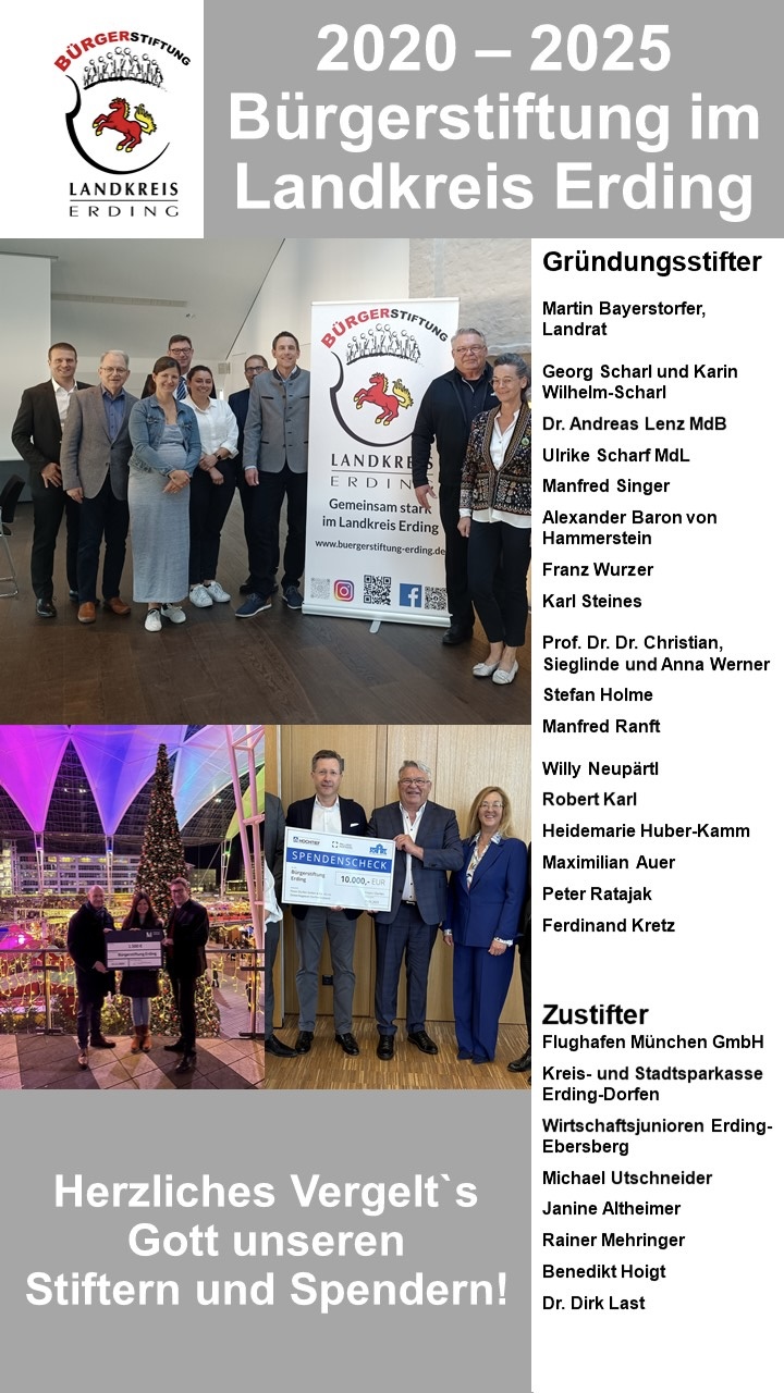 Die Bürgerstiftung im Landkreis Erding ist eine Gemeinschaftseinrichtung von Bürgern für Bürger. Die Stiftung dient dem Gemeinwohl. Ziel ist den Gemeinschaftssinn und die Mitverantwortung der Bürger im Landkreis Erding zu stärken.